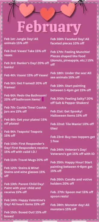 We're on open studio which means you can come in anytime - so pick a seat! We'll explain how all of the glazes work, show you where the brushes are, and help you select from hundreds of pieces of bisque that are ready to paint. Your pieces will be fired in our kilns and ready to be picked up in one week.